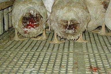 牠們因強迫灌食,身體臃腫、心血管負坦加重。因體重過高而壓迫腿部,形成骨病,經常動彈不得。餵食管經常刺穿動物的喉嚨,他們之中的許多因此流血致死。