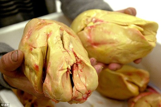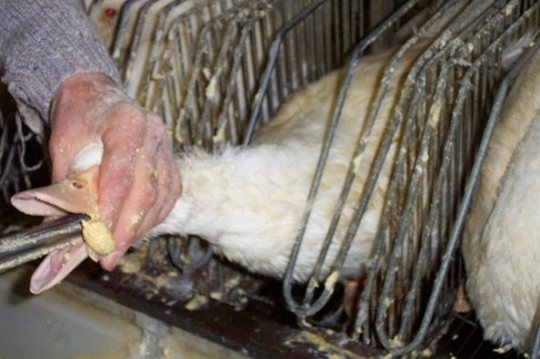 肥鵝肝的生產過程病態至極。從鵝鴨只有8周大時,工人們即一天內數次用金屬管把重達兩公斤的穀物、玉米和脂肪硬打入鴨和鵝的胃里。