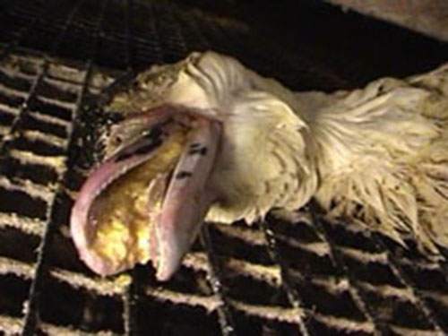 看看被強迫餵食的鳥類屍體,可以發現嚴重的內出血、霉菌及細菌感染,和肝性腦病——這是一種由肝衰竭所引起的腦部疾病。和一般鳥類相比,牠們的死亡率比正常高出20倍。