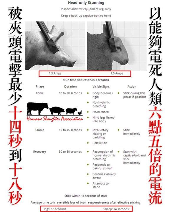 那麼自稱「人道屠宰」究竟用多少電流呢?對,是 1.3 Amps,即 1300 毫安:即是超過可以令人類死亡的 6.5 倍。