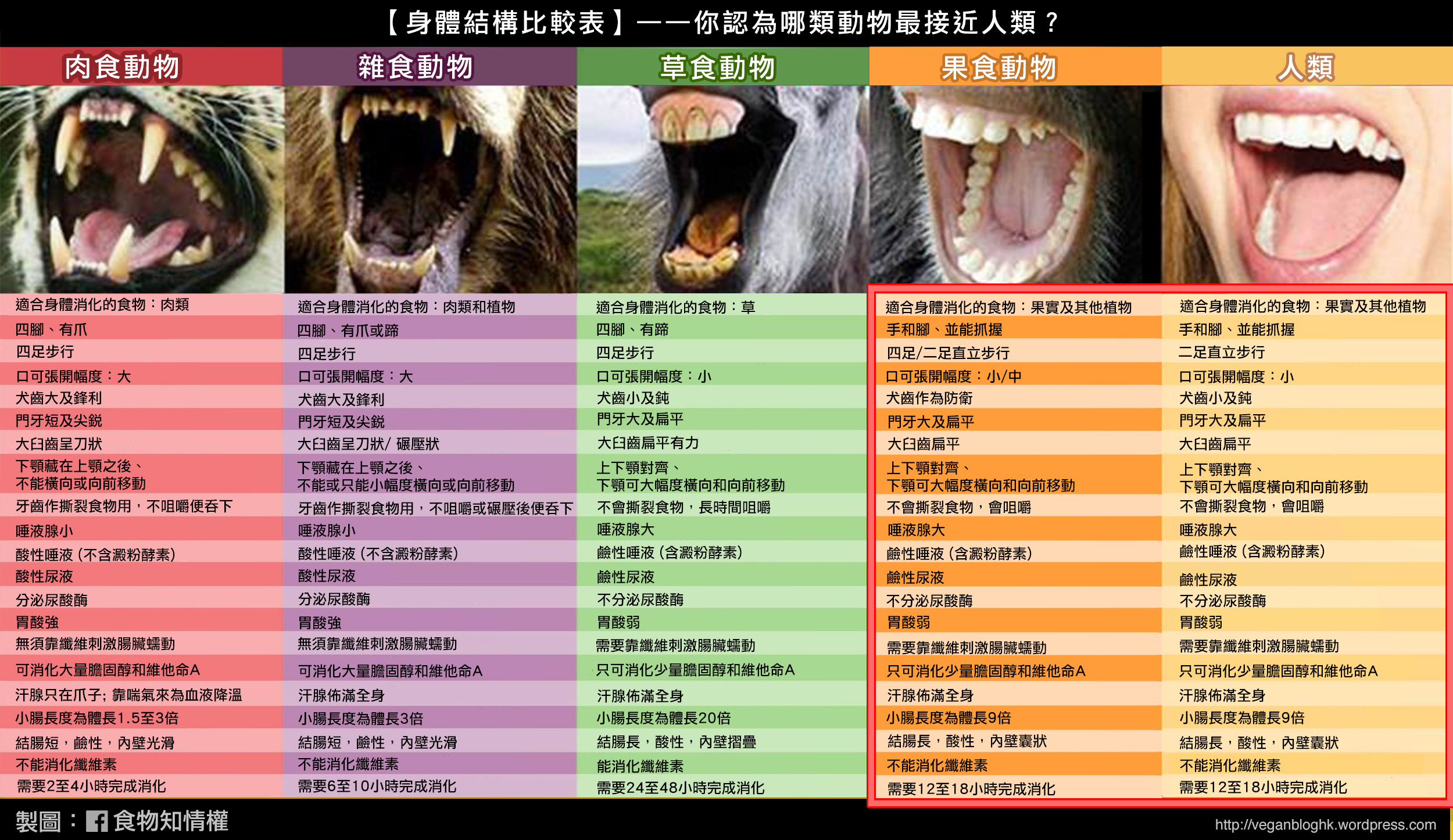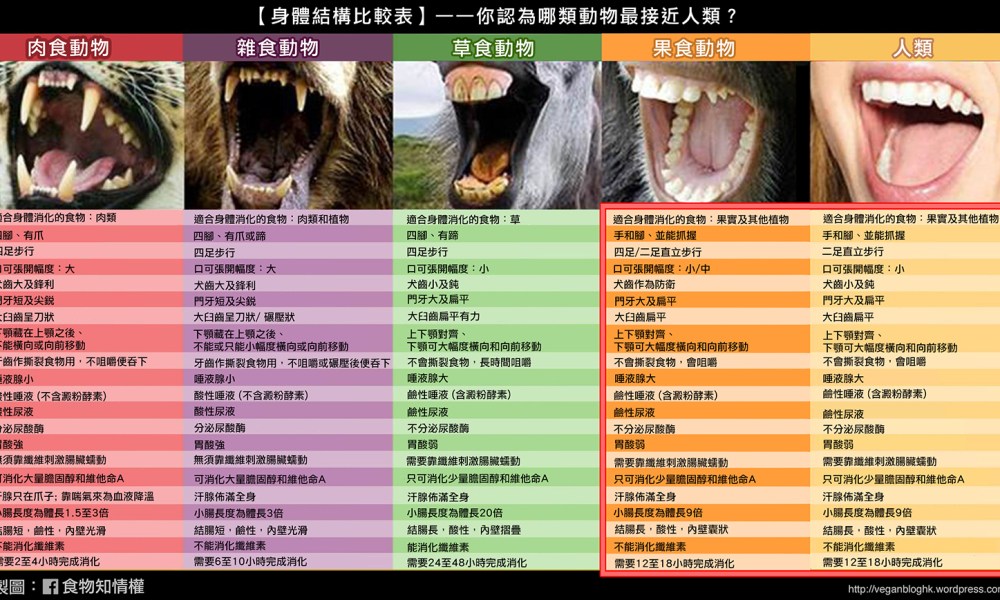 雖然現在不少人都自稱是「食肉獸」,但只要細心比較我們的身體結構, 就會發現我們其實是更像植物性飲食的動物。