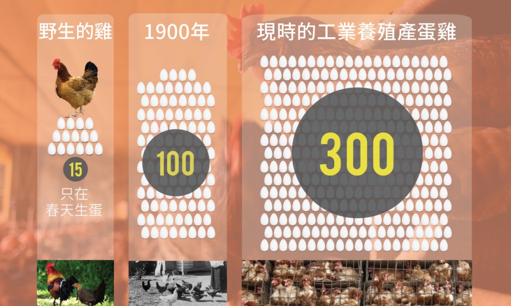 母雞由在野外生活,直到被工業化養殖以後,產蛋數量如何能提升足足20倍之多?單看數字的話,真不得不驚嘆近年科技發展之神速;可是雞隻並非冷冰冰的產蛋機械,乃是有血有肉之軀。現在我們不用等院子裏的母雞下蛋,想吃炒蛋、煎蛋時只要往超級市場購買便可,一年四季什麼時候也買到。我們比上一代多吃雞蛋,享受這種「方便」的同時,背後母雞的痛苦及人類付出的代價多大,你又知道嗎?