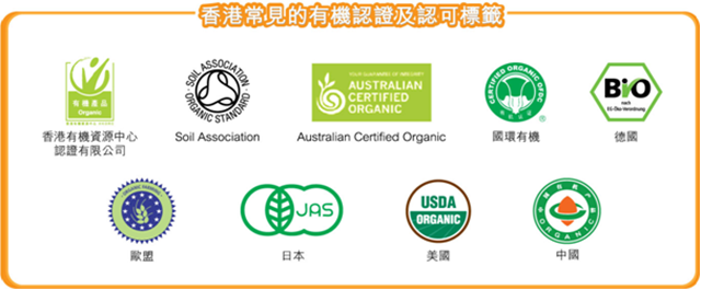 上圖是一些常見的有機產品認證的標籤,這些登記成為有機操作的農場會受到有機認證中心的監管。各個認證中心的條例要求各有差異,但原則上大致相同;以「香港有機資源中心」為例;有機農場不能位於嚴重污染源附近﹑不使用化學肥料﹑化學農藥﹑基因改造成分的物料等。